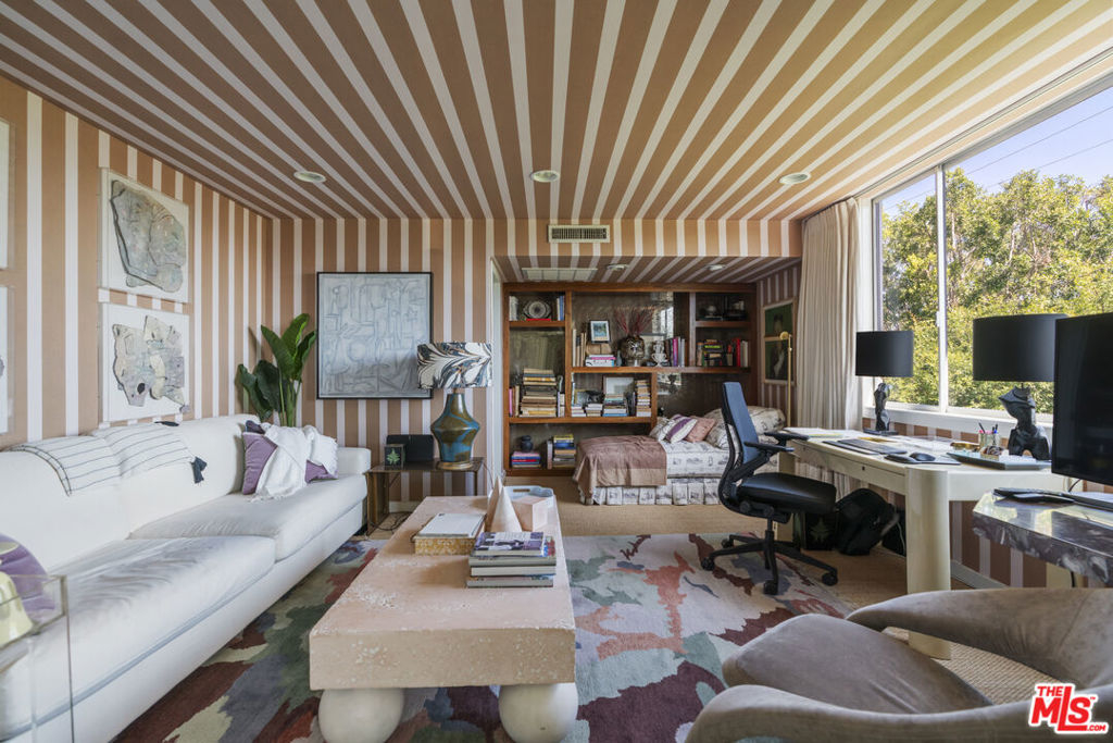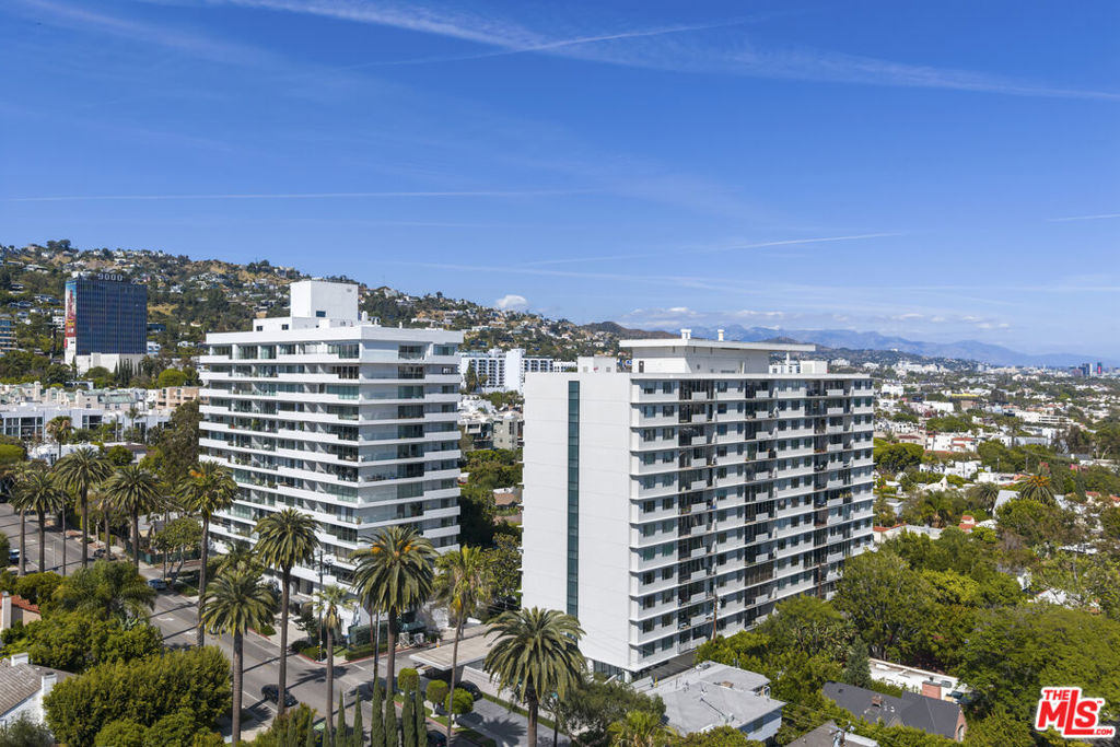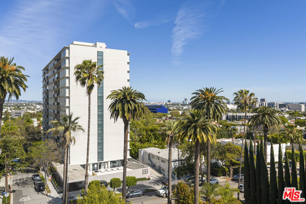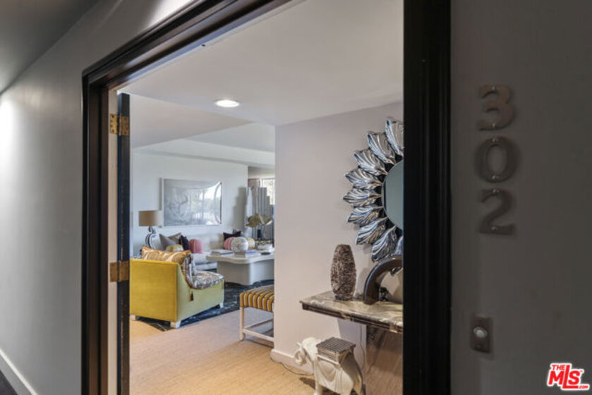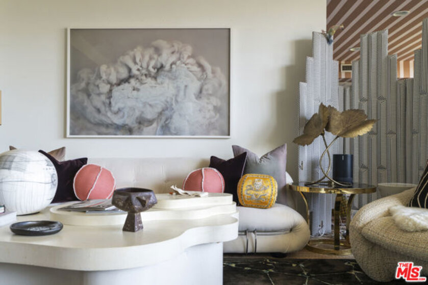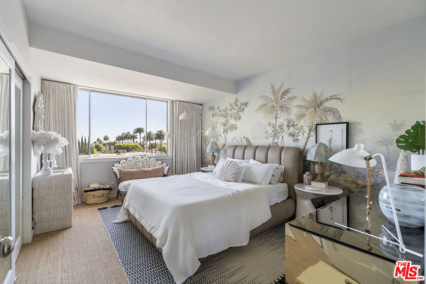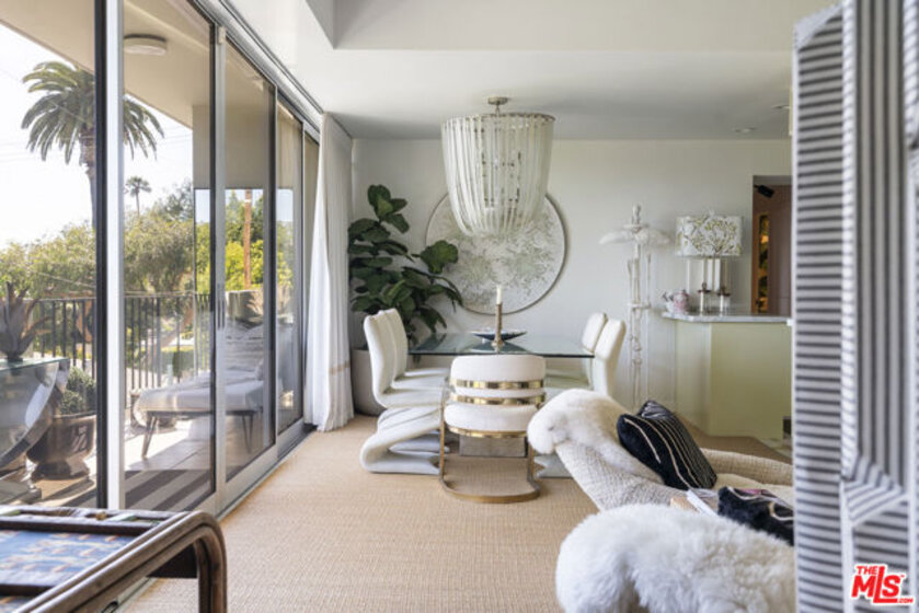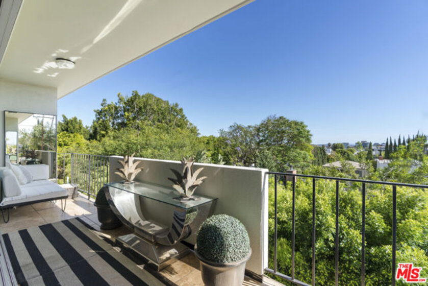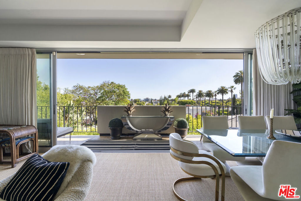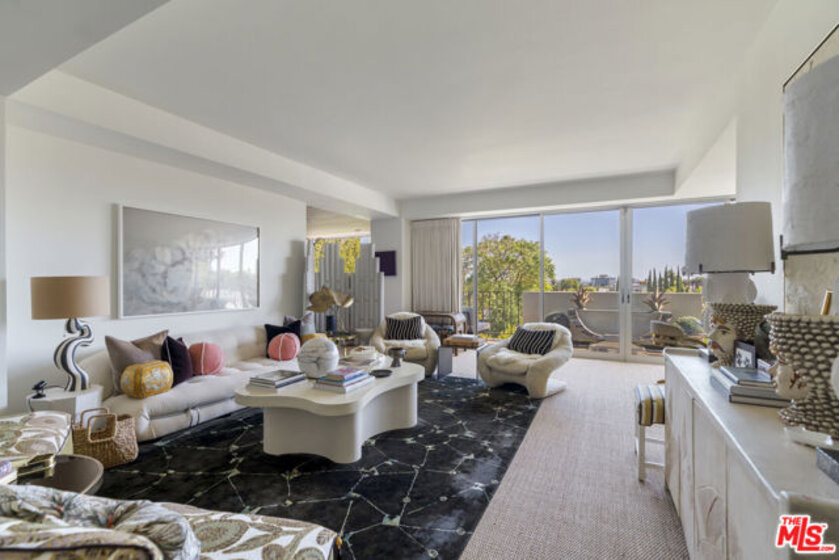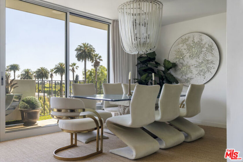Perched within the iconic Doheny Plaza, this designer-renovated residence pairs classic mid-century architecture with bold, magazine-worthy interiors and sweeping palm-lined views across West Hollywood and beyond. Spanning approximately 1,793 square feet, the home offers effortless indoor-outdoor flow that combines substantial scale with one of the building's most desirable locations, and an ultra-rare and spacious two-bedroom, three-bath layout plus a den with its own half bath (currently styled as a lounge/office and easily adaptable as a third bedroom). Walls of glass open the expansive living and dining areas onto a generous terrace, where sunshine, skyline glimpses, and rows of swaying palms create an unmistakably Los Angeles backdrop. Inside, oversized rooms offer ideal proportions for entertaining, displaying art, or simply relaxing in a space custom-crafted for artistry and appreciation. The interiors are richly layered and distinctive, with statement lighting, curated finishes, and a level of personality rarely found in condominium living. The den, currently designed as an intimate lounge/office, adds a rare layer of flexibility and drama to the floor plan. Wrapped in striking custom striped walls, built-ins, and workspace, it works beautifully as a media room, sophisticated home office, or stylish retreat. With its own half bath, it also offers a natural conversion to a third bedroom, creating a uniquely functional flex space seldom found in condominium living. The kitchen balances vintage charm with modern function, featuring stone counters, ample cabinetry, and upgraded stainless steel appliances. Both bedrooms are oversized retreats with treetop views and copious natural light, while the baths have been transformed into jewel-box moments with custom wallpaper, stone surfaces, and boutique-hotel style. Doheny Plaza is an iconic, full-service mid-century landmark offering 24-hour security, front desk and concierge service, valet parking, gated subterranean parking, a heated saltwater pool, sun deck with lounge areas, fitness center, social/conference space, guest suites for visitors, extra storage, and laundry rooms on each floor. HOA dues include water, hot water, electricity, sewer, trash, heating and cooling, basic cable, and concierge and valet services. The building is ideally positioned on the border of West Hollywood and Beverly Hills, just moments from the Sunset Strip, premier dining, shopping, and nightlife.