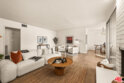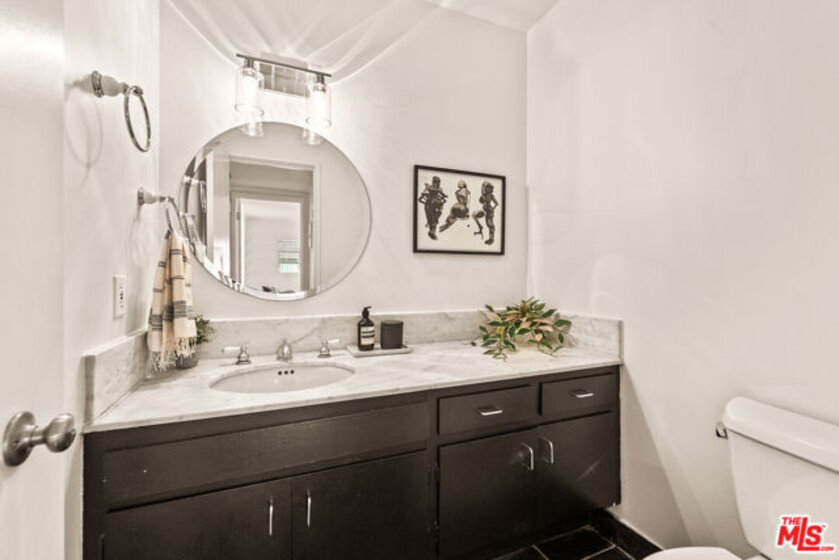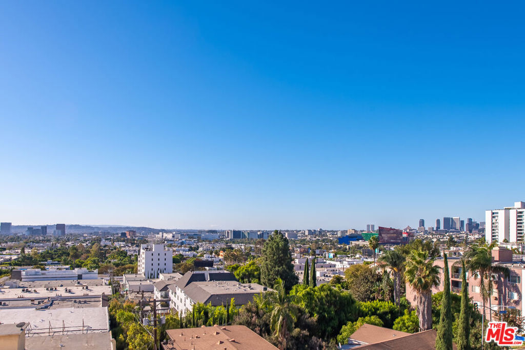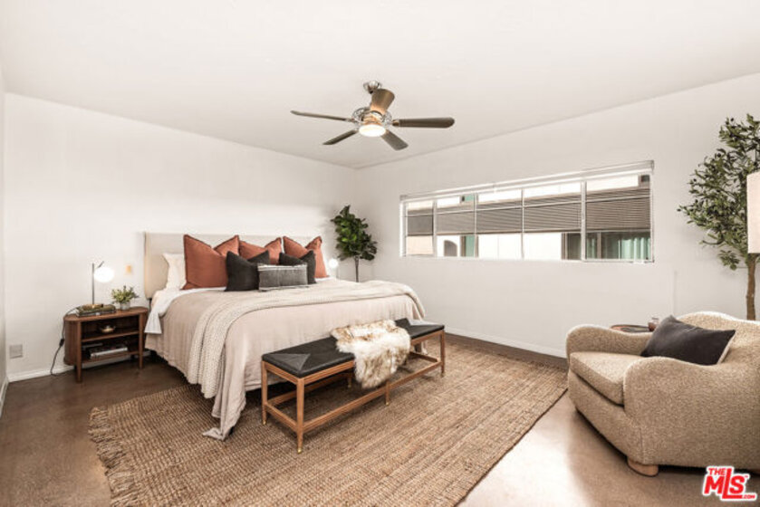 This expansive 1,077 sq ft top-floor, corner unit offers 1 bedroom and 2 baths, tucked away at the rear of the building, adjacent to The Pendry. Enter through grand double doors into an open and inviting living area, perfect for relaxation or entertaining, featuring polished aggregate concrete floors throughout. Enjoy hillside and greenery views from a private balcony. The dining area adjoins an updated galley-style kitchen with stylish casement windows. A convenient powder room for guests is located near the entry, and the unit includes in-unit laundry. The bedroom boasts casement windows, multiple closets, and a full bath with a separate makeup station, bathtub, shower, and elegant Carrera countertops.