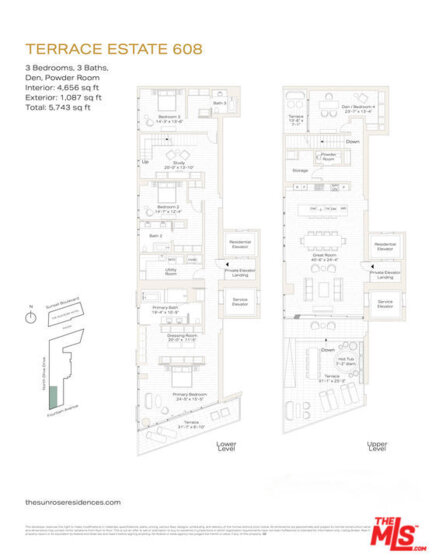 Part of the final collection at The Sun Rose Residences (formerly Pendry Residences West Hollywood), Terrace Estate Duplex 608 offers a 4BR, 3.5BA private retreat in the heart of West Hollywood. Designed by EYRC Architects with interiors by Martin Brudnizki, this 4,656 SF home features floor-to-ceiling glass with commanding views of Downtown LA and a 1,087 SF private terrace with spa extending the living space outdoors. The expansive great room centers on a chef's kitchen with an oversized Calacatta Borghini marble island and Sub-Zero and Wolf appliances. The primary suite includes a Poliform walk-in closet and a spa-inspired bath finished in Arabescato Cervaiole marble. Owners enjoy personalized residential services and access to The Sun Rose Hotel's amenities, including dining, wellness offerings, and a live music venue, all set along the iconic Sunset Strip.