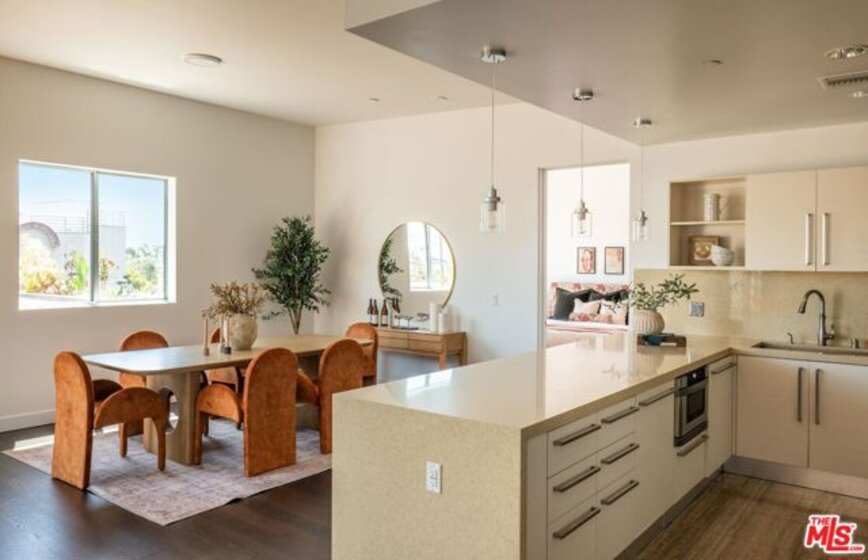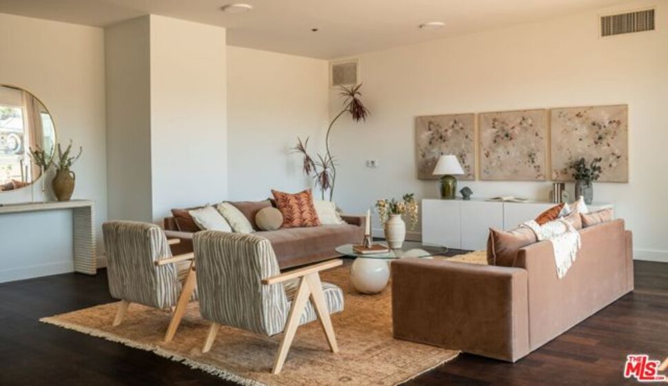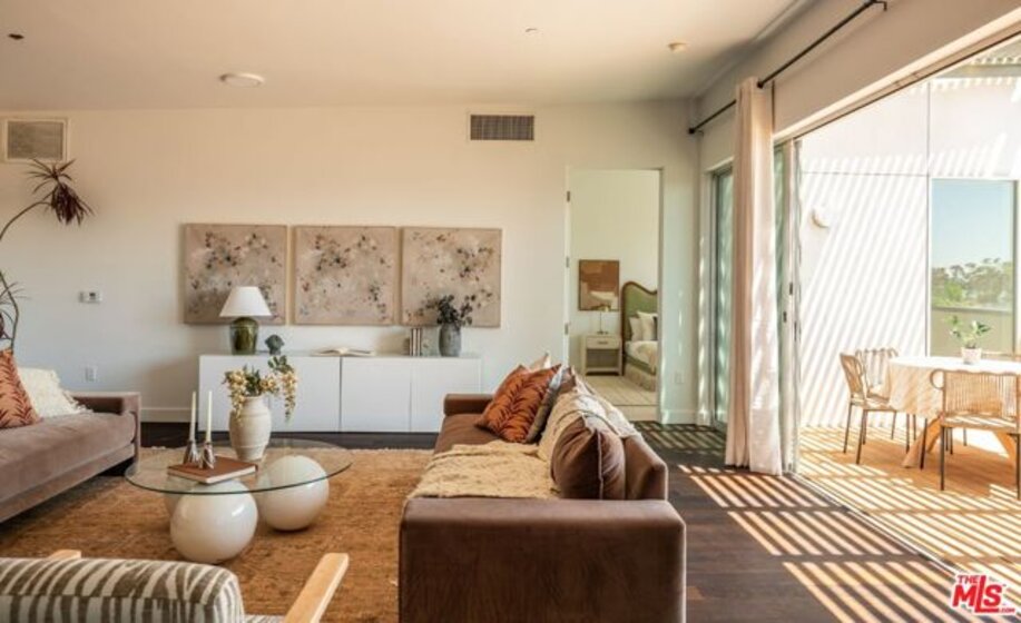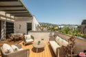 Perched on the top floor of this iconic architectural gem designed by Zoltan Pali, FAIA. This sophisticated Penthouse conveys urban elegance and the coveted California lifestyle with an open concept floor plan, soaring ceilings, sleek wood floors and expansive walls of glass that open seamlessly onto a sprawling patio. Framed by lush meticulously designed landscaping, the patio offers stunning hilltop views, perfect for both relaxation and entertaining. The chef-inspired kitchen, complete with a breakfast bar, is ideal for hosting gatherings or enjoying casual meals. Two generously sized master suites each feature their own private patios, luxurious en-suite bathrooms, and walk-in closets, providing a perfect blend of comfort and privacy. Additional amenities include side-by-side parking, a private storage room, and in-unit laundry for ultimate convenience. Located steps from Melrose Place in the vibrant heart of West Hollywood, this Penthouse is a rare opportunity to experience elevated living in LA's most desirable neighborhood.