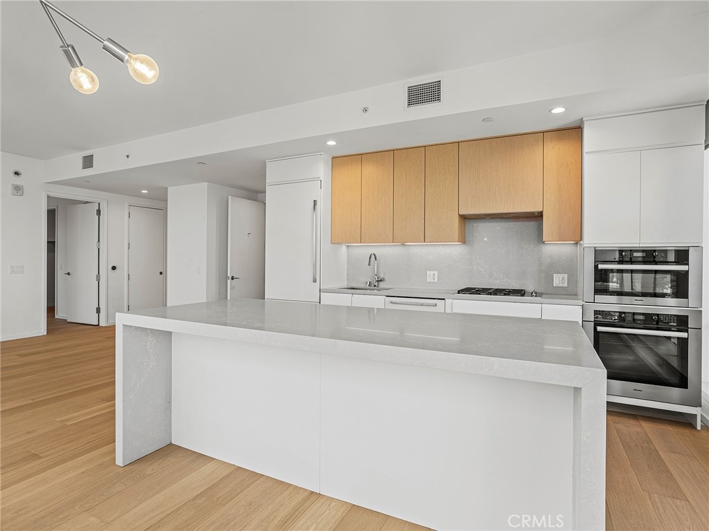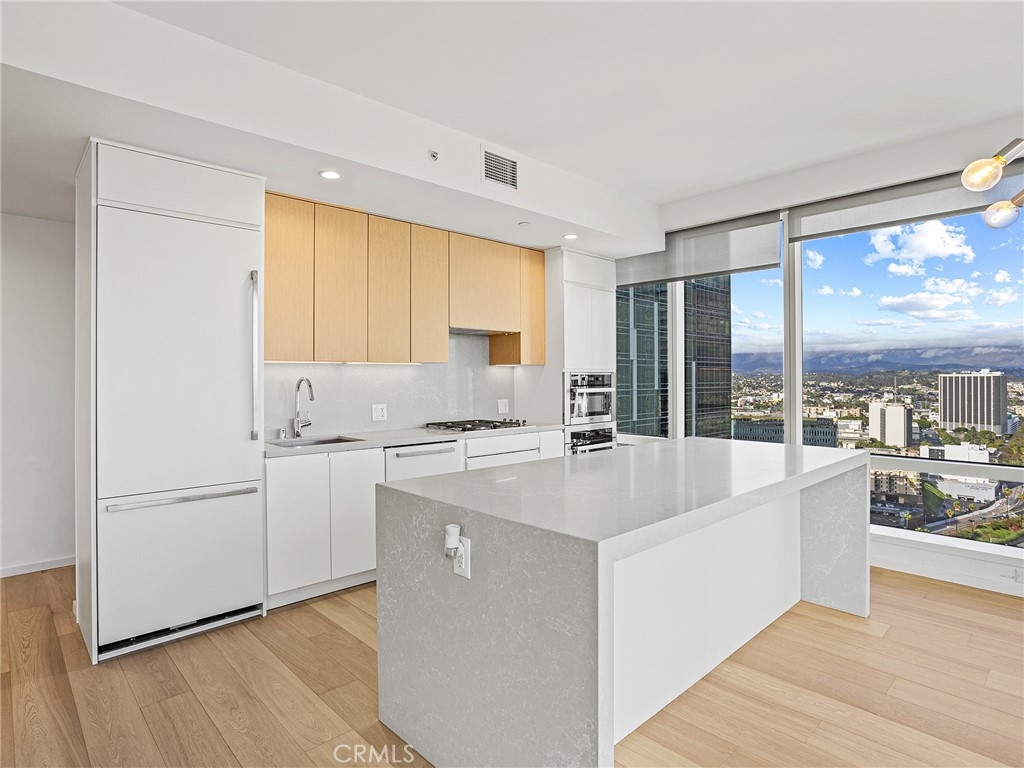 Perched on the 41st floor, this spectacular end-unit residence offers 1,310 square feet of refined living space with 2 bedrooms and 2 bathrooms in a premier luxury high-rise designed by Gensler. A formal entryway welcomes you into a stunning showplace defined by soaring high ceilings and dramatic floor-to-ceiling windows that frame truly breathtaking panoramic views. From sunrise to glittering city nights, enjoy sweeping vistas stretching as far as the LA Harbor, the iconic Hollywood Sign, surrounding mountains, and shimmering city lights. The thoughtfully designed floor plan features a spacious living area that flows seamlessly into a formal dining area, perfect for entertaining and elevated downtown living. The gourmet kitchen is beautifully appointed with a built-in refrigerator, stove, microwave, cooktop, wine refrigerator, expansive center island, and breakfast bar, offering both style and functionality. The spacious primary suite serves as a private retreat, complete with a generous walk-in closet and a well-appointed en-suite bath. A second bedroom and full bath provide comfort and flexibility for guests or a home office. A dedicated laundry area is conveniently located in the hallway. Central heat and air ensure year-round comfort. Experience true resort-style, luxury high-rise living with exceptional amenities including a 24/7 lobby attendant, concierge service, pool, spa, fitness center, putting green, and more. Ideally situated just two blocks from L.A. Live and Crypto.com Arena, you’ll enjoy immediate access to world-class entertainment, along with an abundance of renowned restaurants and vibrant shops right outside your door. This is downtown living at its finest, elevated, sophisticated, and unforgettable.