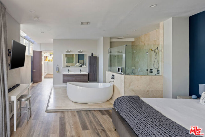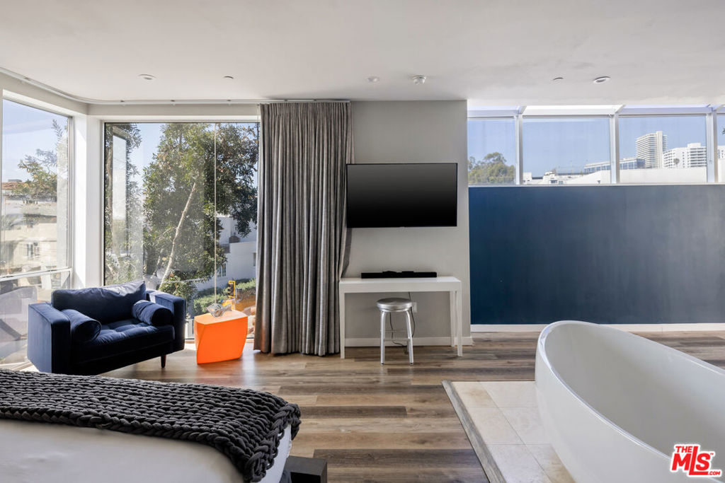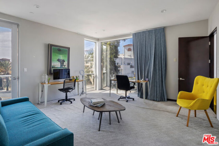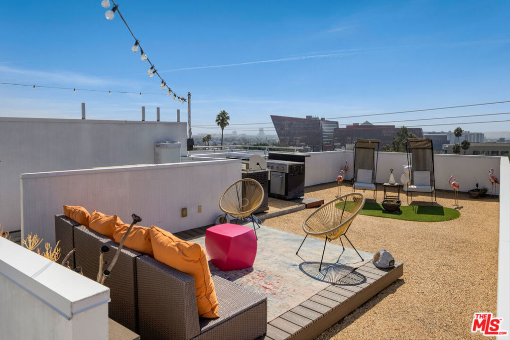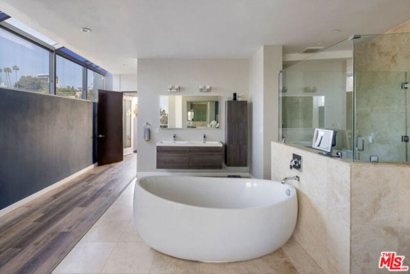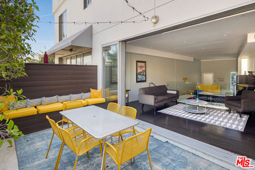 Striking Architectural Modern Townhome - Ideally located in the most desirable area of West Hollywood. The residence features open concept living areas with essential outdoor flow and creative spaces that allow for a flexible use for an owner to customize their living experience with convertible bedrooms to offices, media rooms, etc. The direct-entry first level features; kitchen with custom cabinets, stainless appliances, quartz countertops and travertine tile flooring. An entry, living room and dining area are light filled with a retractable wall of glass that opens to an alfresco dining patio. A powder room and dark hardwood flooring throughout. The second level consists of two guest rooms, two baths, laundry closet, and a small balcony. The primary bedroom suite occupies the entire upper level with incredible spa-style open-concept bath with dual vanity, glass shower, soaking tub, and dual closets. A spacious private rooftop deck offers amazing 360 degree views encompassing vistas from downtown LA to the westside, landmarks and the Hollywood hills. A built-in barbecue kitchen area, and lounge areas are perfect for entertaining or simply relaxing in the sunshine. Central air and heat, secure access, 3-car gated parking garage with storage. Ideally located between the famous Sunset and Santa Monica boulevards, steps to the Sunset Strip; luxe shopping, cafes, grocery, nightlife, top restaurants. Zoned for the prestigious West Hollywood Elementary. Only two-units are in the building making this a rare opportunity with low HOA dues.