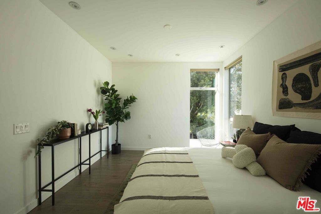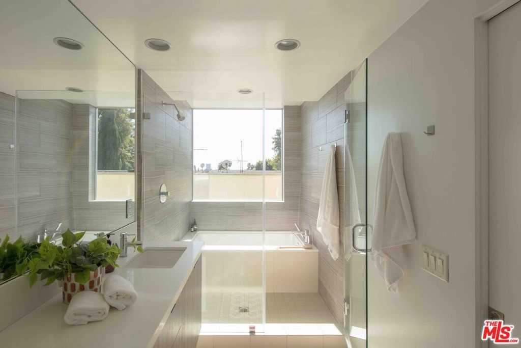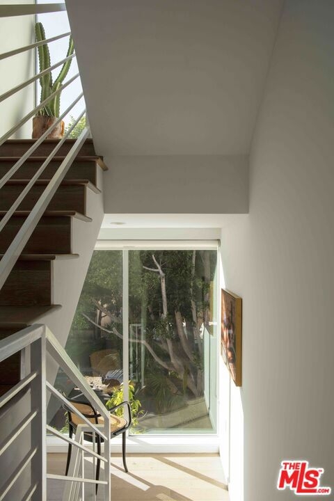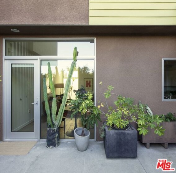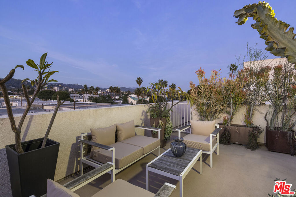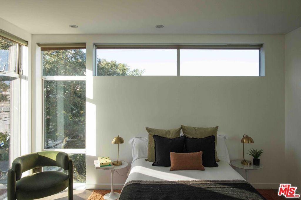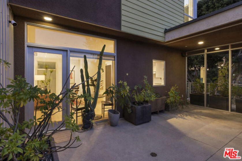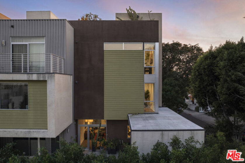 This unique architectural townhouse is the first unit at the corner of a five-unit contemporary building in a prime West Hollywood location between Melrose Avenue and Santa Monica Boulevard, close to shops, dining, and daily amenities. Visible as a vertical glass tower above street level, it defines the front facade and brings natural light through the staircase into the different levels. Mature trees surround the building and create privacy as well as treehouse-like outlooks from the corner bedroom windows. The home offers four levels of interior living space and includes a roof terrace with panoramic views toward the Hollywood Sign, Griffith Observatory, and the city. The main entrance is located on the second level behind a gated patio that opens directly into the living room and kitchen, creating a seamless indoor-outdoor transition. Two primary suites on the third and fourth level, each featuring spa-style bathrooms and walk-in closets, are flooded with light. An additional bedroom and full bathroom are located on the first level and can be accessed either internally from the living space or directly from the exterior, allowing flexibility for use as a guest suite, office, or studio. Custom built-in cabinetry enhances the functionality of the space. Additional features include an in-unit washer and dryer, central heating and air conditioning, European appliances, Caesarstone countertops, two side-by-side parking spaces, and extra storage space in a gated garage.