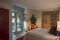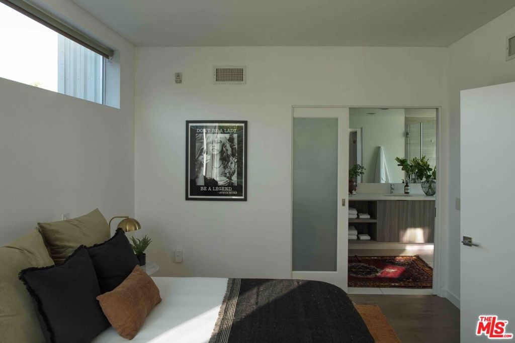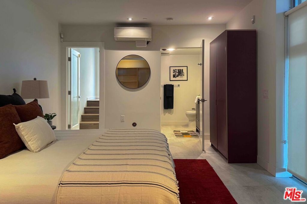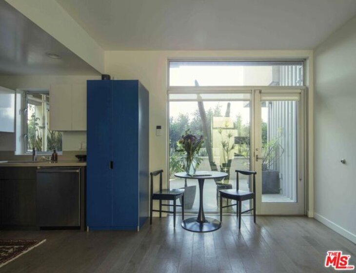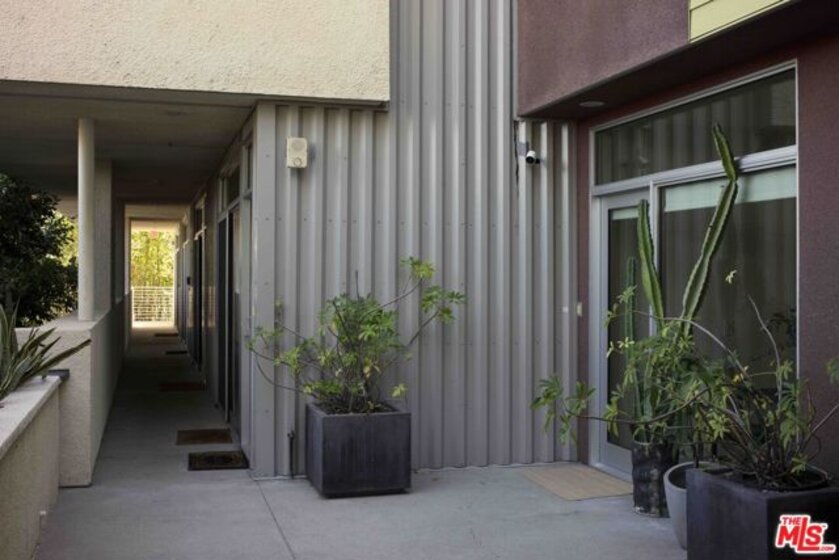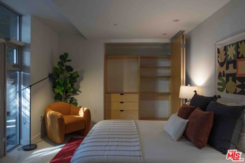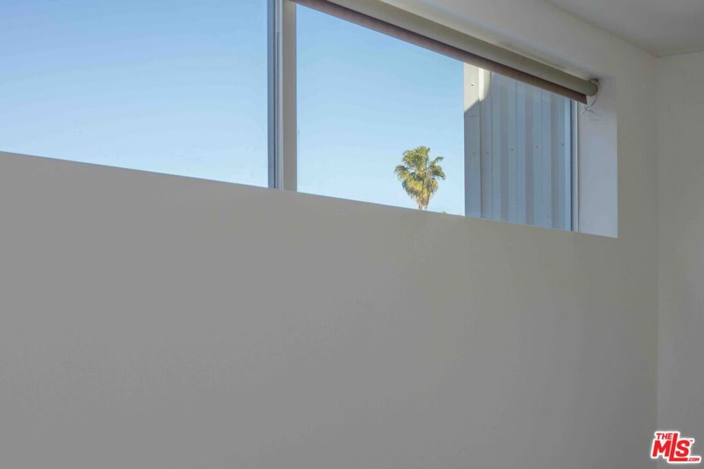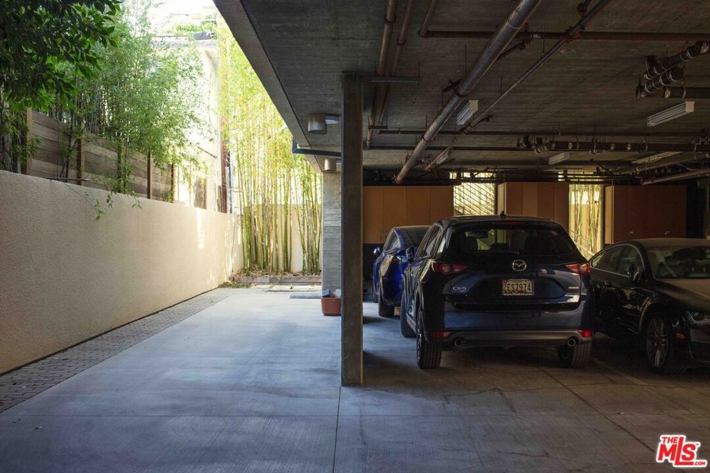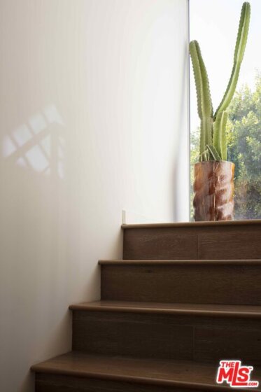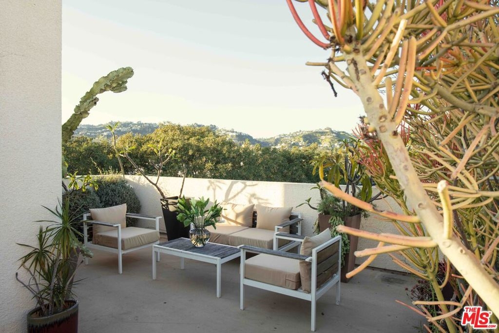 This unique architectural townhouse is the first unit at the corner of a five-unit contemporary building in a prime West Hollywood location between Melrose Avenue and Santa Monica Boulevard, close to shops, dining, and daily amenities. Visible as a vertical glass tower above street level, it defines the front facade and brings natural light through the staircase into the different levels. Mature trees surround the building and create privacy as well as treehouse-like outlooks from the corner bedroom windows. The home offers four levels of interior living space and includes a roof terrace with panoramic views toward the Hollywood Sign, Griffith Observatory, and the city. The main entrance is located on the second level behind a gated patio that opens directly into the living room and kitchen, creating a seamless indoor-outdoor transition. Two primary suites on the third and fourth level, each featuring spa-style bathrooms and walk-in closets, are flooded with light. An additional bedroom and full bathroom are located on the first level and can be accessed either internally from the living space or directly from the exterior, allowing flexibility for use as a guest suite, office, or studio. Custom built-in cabinetry enhances the functionality of the space. Additional features include an in-unit washer and dryer, central heating and air conditioning, European appliances, Caesarstone countertops, two side-by-side parking spaces, and extra storage space in a gated garage.